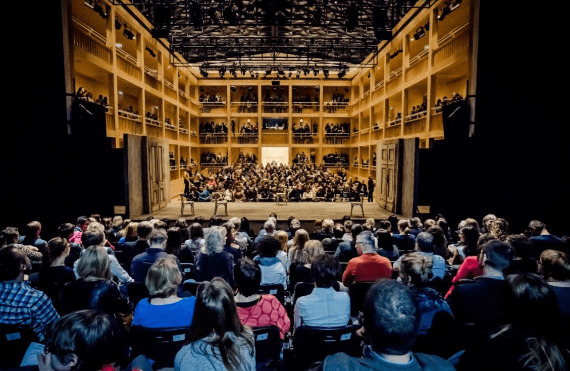 Otwarty dach pokazuje prawdziwy klejnot: drewniana sala, w której widzowie mogą przebywać na świeżym powietrzu. Ruchoma scena i widownia pozwalają na tradycyjną włoską scenę w kształcie „pudełka”, elżbietańską wysuniętą scenę, okrągłą arenę otoczoną przez widzów, a nawet salę o powierzchni 400 m2. Pozostałe pokoje znajdują się na dwóch piętrach z tarasem na dachu. Na zewnętrznych krawędziach wokół kompleksu znajdują się specjalne ścieżki.