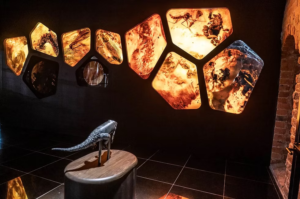 На площади около тысячи квадратных метров представлено более тысячи экспонатов и ряд инсталляций. Музейное повествование начинается с геологической древности: янтарь предстает как окаменевшая смола древних лесов, существовавших более 40 миллионов лет назад. Растения и животные, застывшие в прозрачной субстанции — фрагменты листьев, шишки, насекомые, ящерицы, пауки, перья — переносят посетителя в мир, который исчез задолго до появления человека.